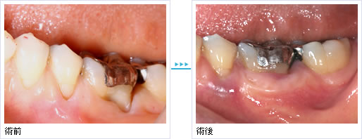 - 下の奥歯が歯茎が下がり、冷たいものがしみるということで来院されました。粘膜移植を行いブラッシングがしやすくしみることもなくなりました。
