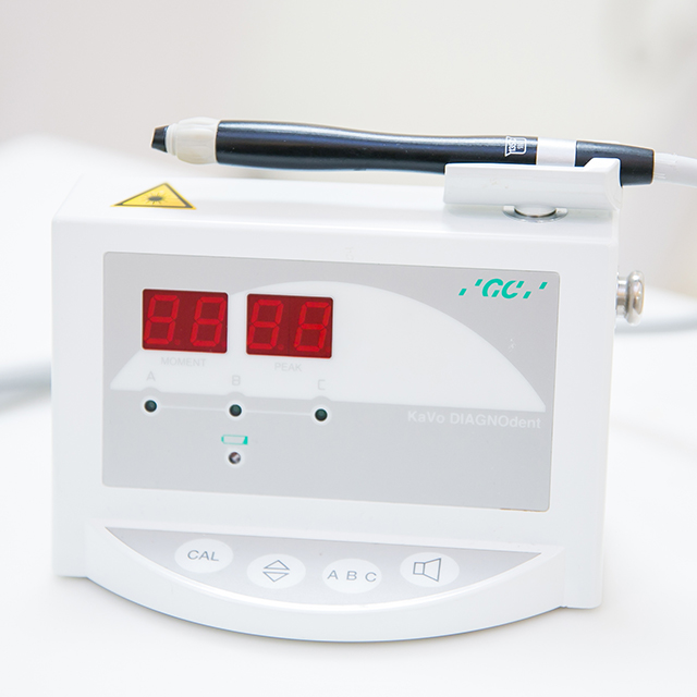 - 目では確認しにくい歯と歯の間や、歯の内部のむし歯の大きさをレーザーをあてて確認します。